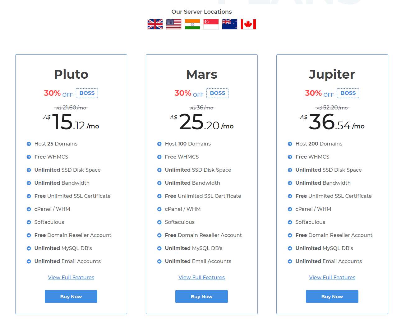 The WHMCS reseller hosting plans start from Pluto at A$ 15.12/mo followed by Mars at A$ 25.20/mo and Jupiter at A$ 36.54/mo.